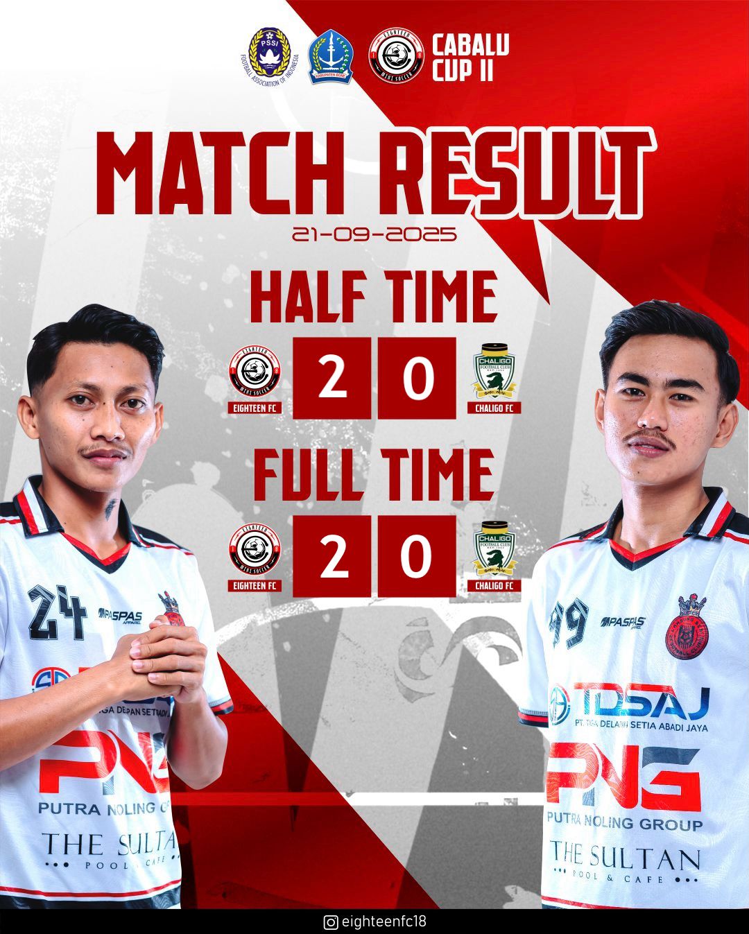 EIGHTEEN FC kembali menorehkan sejarah di ajang Cabalu Cup II setelah berhasil memastikan langkah ke babak semifinal. Pertandingan penuh gengsi itu berakhir manis usai anak asuh Kepala Pelatih Ikbal Hamzah menundukkan Chaligo FC dengan skor meyakinkan 2-0.