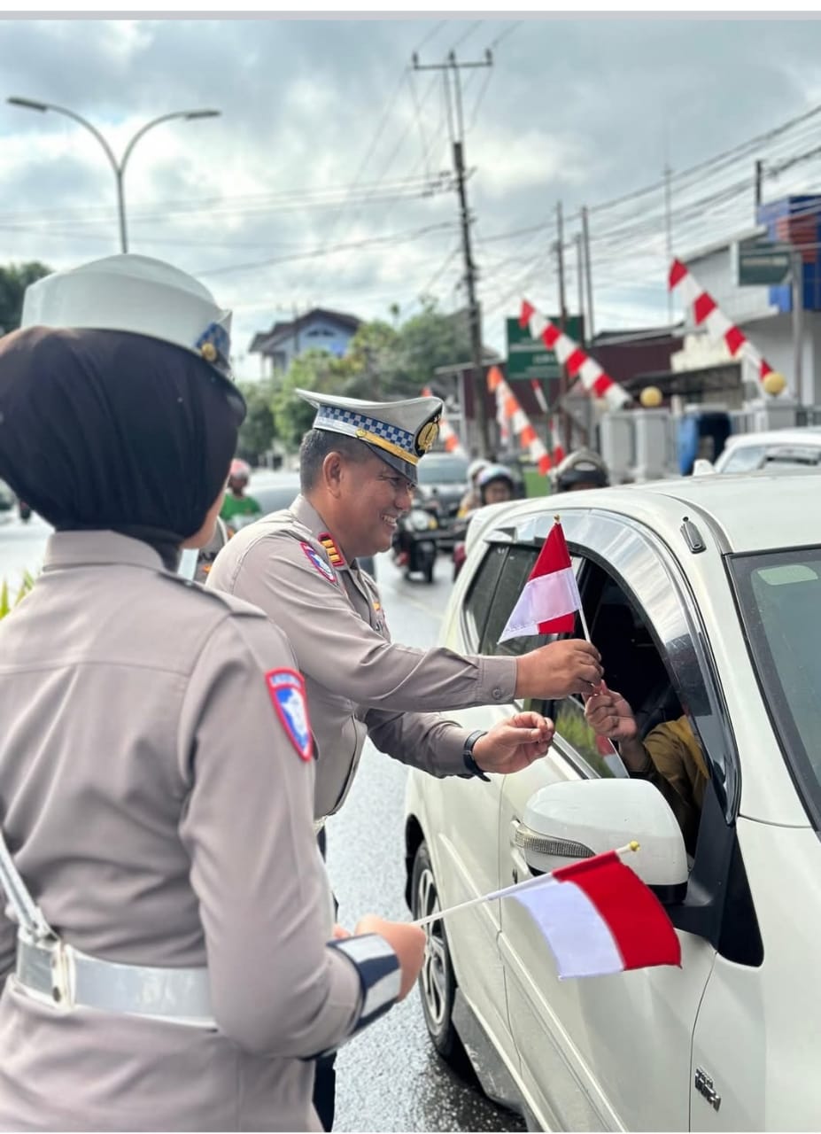Dalam suasana yang penuh semangat kebangsaan, para petugas membagikan Bendera Merah Putih kepada pengendara sepeda motor, mobil, yang sedang melintas.