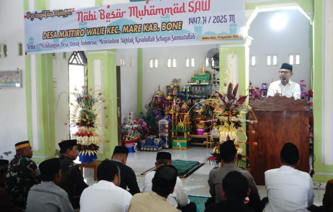 LATENRITTA NEWS.COM BONE— Wakil Bupati (Wabup) Bone Andi Akmal Pasluddin, didampingi Wakil Ketua TP PKK Kabupaten Bone, Maya Damayanti A. Akmal menghadiri acara peringatan Maulid Nabi Muhammad SAW 1447 H / 2025 M yang berlangsung di tiga lokasi wilayah kabupaten Bone, Jumat, 19 September 2025.